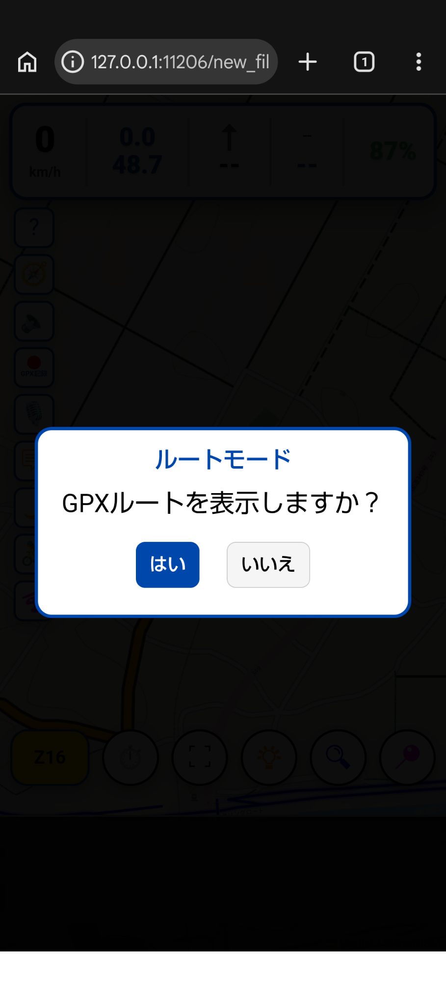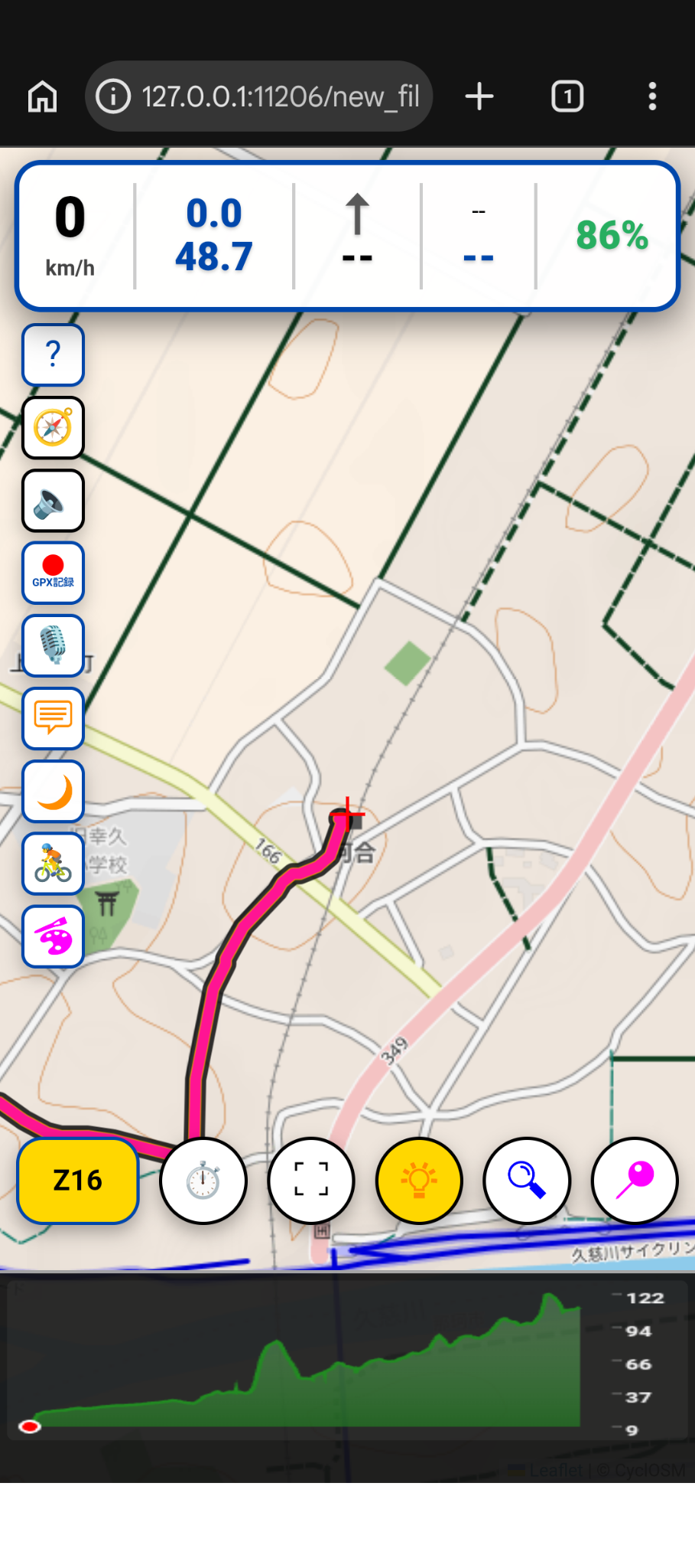 👉 最初は右下の「📍」をクリックする。GPS機能がONにされて、ルートでの現在位置に画面が移動します。