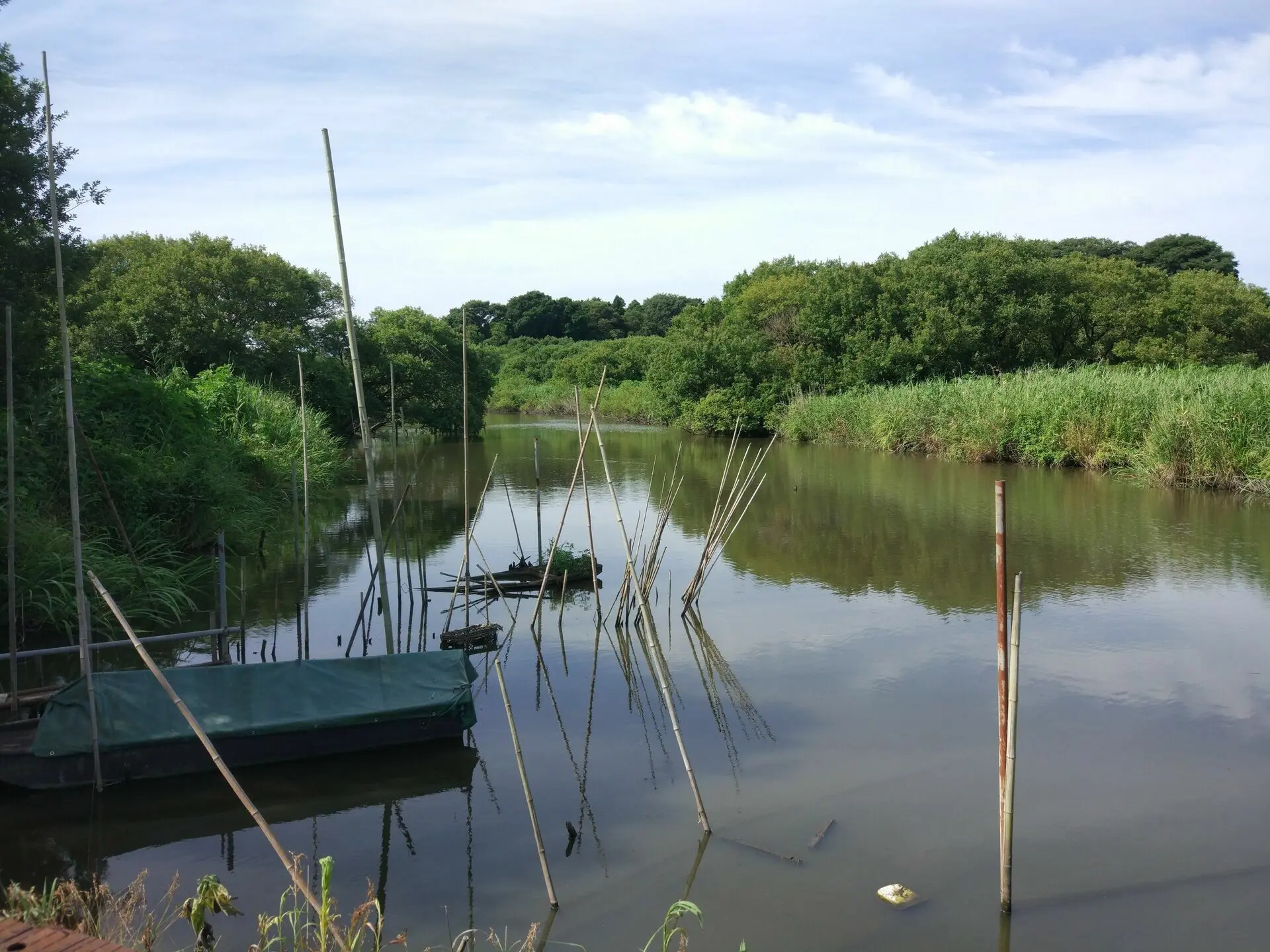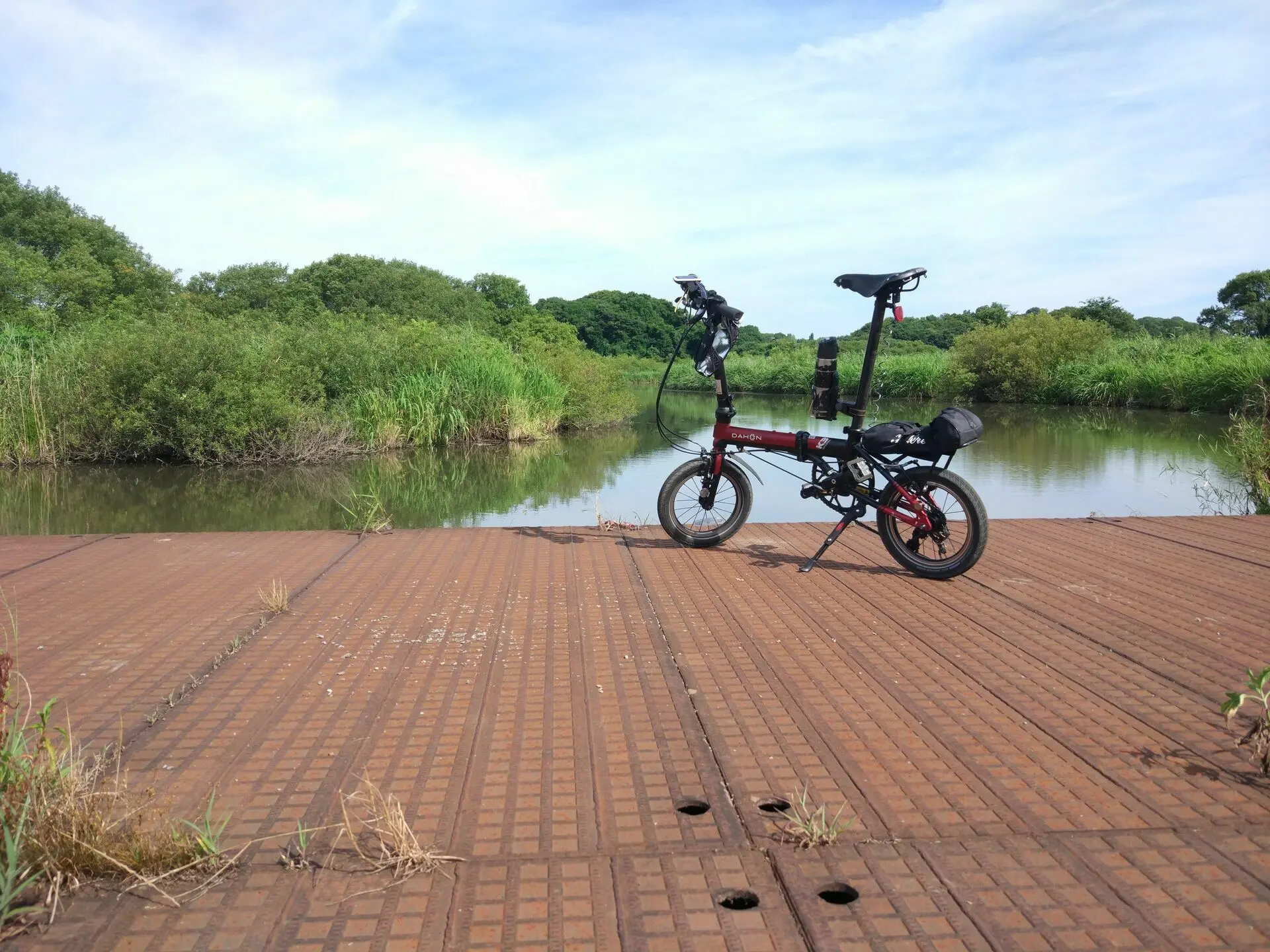 Du côté de Bandō, je suis tombé par hasard sur un marais, dans un coin aménagé sous l’appellation 菅生沼ふれいあい広場 (Sugaonuma Fureai Hiroba). Avec la chaleur de l’après-mousson, l’endroit était complètement désert. Sous nos pieds et roues, la promenade aménagée au cœur du marais était toute en acier, ça roulait donc très bien, mais les oiseaux qui auraient dû se trouver sur l’eau brillaient par leur absence.