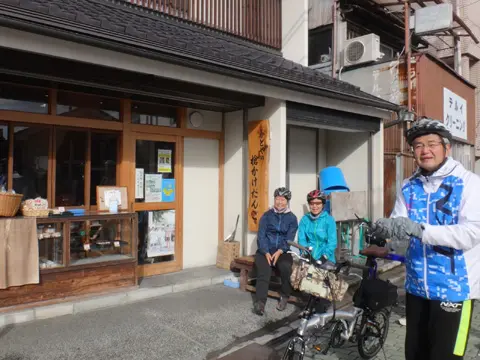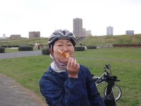 La balade ne fait que commencer, mais les cyclistes en profitent pour acheter quelques dango chez ce marchand spécialisé, qui les vend généreusement au prix très abordable de 100 yens. À consommer plus loin sur le trajet, quand les estomacs se mettront à faire de petits sons bizarres…