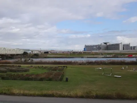 Le parcours de la balade emprunte ensuite la piste cyclable du fleuve Arakawa, où il passe devant le Centre de détention de Tokyo (東京拘置所), sur l’autre rive.
