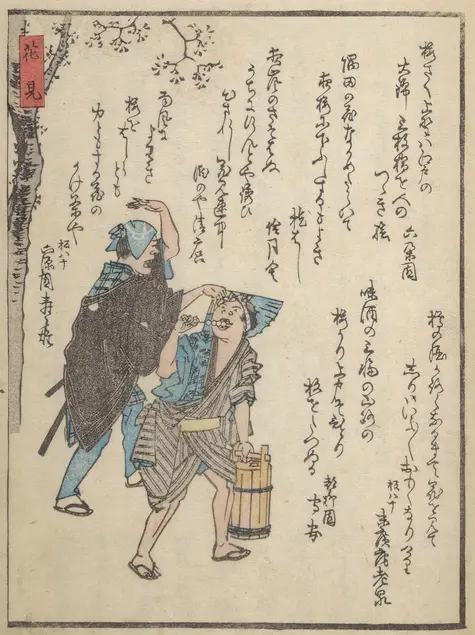 *Illustration tirée de [狂歌四季人物] (https://www.hiroshige.org.uk/Illustrated_Books/Slideshows/KyokaShikiJinbutsu_Slideshow.htm). Littéralement, « Poésies parodiques sur les gens en toutes saisons » (ma traduction… on en trouve d’autres sur le Net).