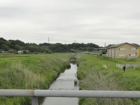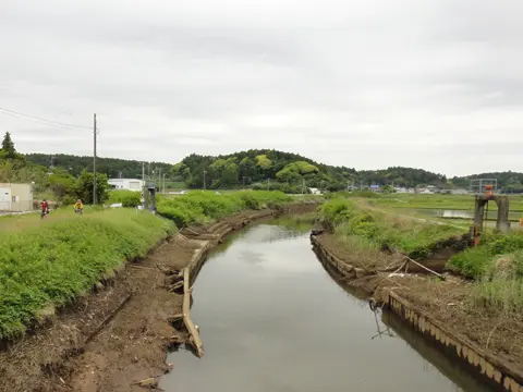 Le trajet passe ensuite par la route préfectorale 112, jusqu’au pont Takoe (田越橋). Nous sommes maintenant sortis des collines et bas-fonds. De là, la rivière Kidogawa ira se jeter dans l’océan, huit kilomètres plus loin, en plein cœur de la plage de Kujūkuri. Lors du grand séisme de 2011, nous apprend Sider, le tsunami s’est rendu jusqu’à ce pont.