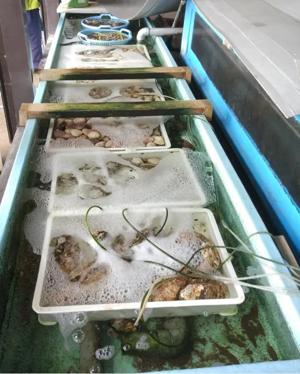 Les fruits de mer se trouvent à l’extérieur, devant le resto, dans un grand bassin bleu