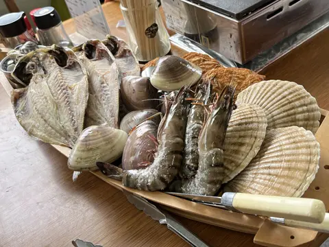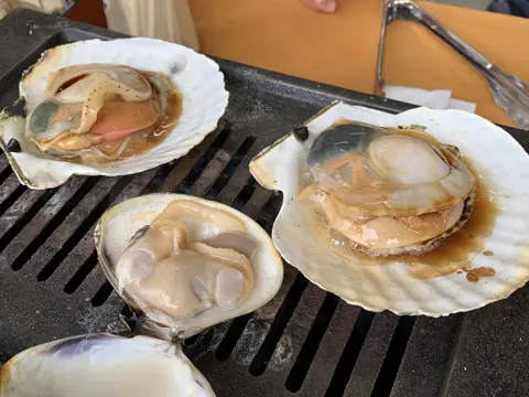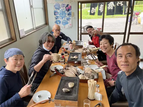 Pour la pause du midi, le groupe s’arrête au resto « Jibun de yaku — Yakihama no Mise » (自分で焼く やき蛤の店). Les fruits de mer y sont servis tels quels, et nous les faisons cuire nous-mêmes (Jibun de yaku) sur de petits réchauds au gaz.