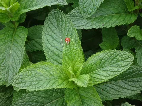 Coccinelle sur feuille de menthe
