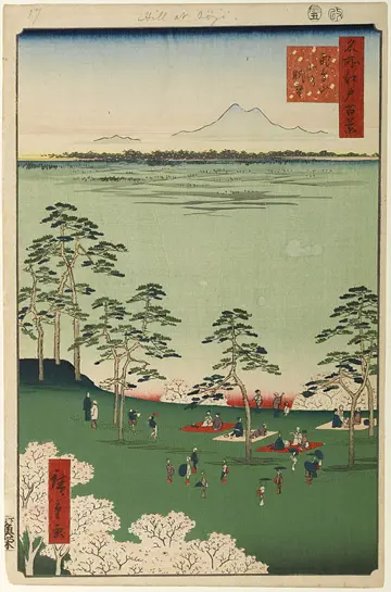 Troisième estampe des cent vues : « Vue vers le nord à partir du mont Asuka » (mai 1856, Printemps, planche 17 sur Wikipédia)