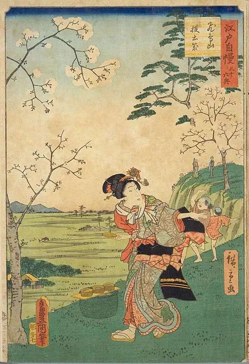 Sur la version originale de 1856, derrière les gens venus contempler les cerisiers, on aperçoit des pins, une étendue de rizières dans la vaste plaine du Kantō et, tout au loin, le mont Tsukuba. Au pied du mont, à la lisière des arbres, une fine ligne bleue représente le cours du fleuve Tonegawa.
