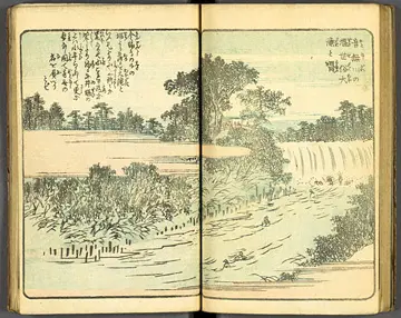 Barrage sur la rivière Otonashi à Ōji (1857, Printemps, planche 19 sur Wikipédia)