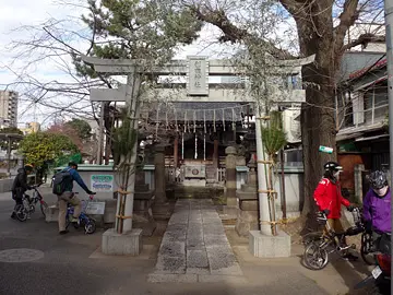 🚴 Dans le billet précédent, le groupe a roulé jusqu’à l’actuelle anse de Shinagawa (品川浦) et j’ai présenté l’estampe (ci-dessus) de l’ancienne langue de terre de Shinagawa (品川すさき). Nous allons maintenant nous rendre sur les lieux de cette langue de terre et pénétrer dans le sanctuaire. Ce faisant, nous allons rouler sur la rue Yatsuyama, où passait autrefois le cours de la rivière Meguro. La photo ci-dessous a été prise à l’entrée de ce petit sanctuaire, devant le torii qui se trouve sur la droite de l’estampe (la couleur du torii a changé depuis, et sans doute son emplacement exact).