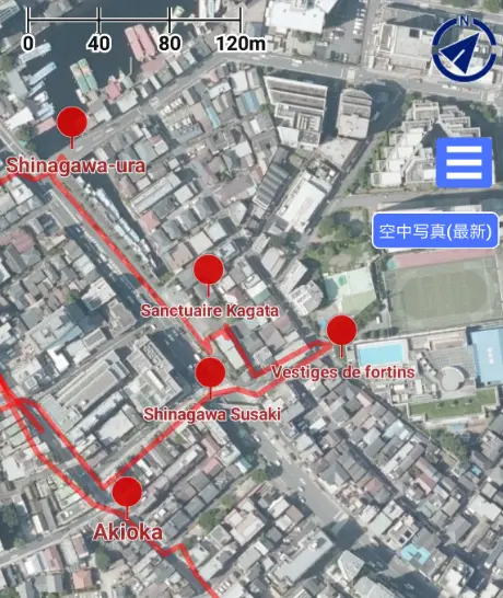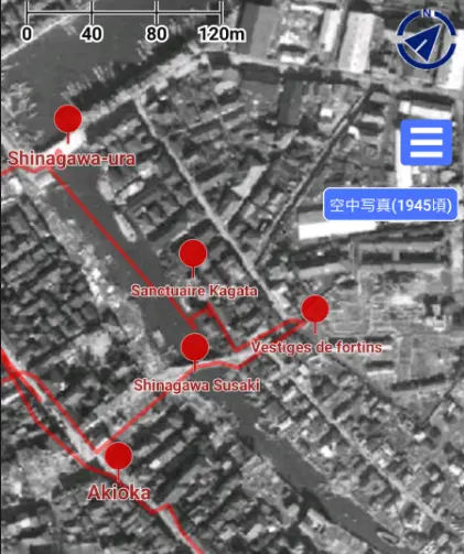 Pour se mettre un peu dans l’ambiance de l’époque, même s’il est impossible de remonter jusqu’aux années 1850 du peintre Hiroshige, on peut afficher une image aérienne de 1945 sur l’application GPS « スーパー地形 » . Le trajet descend en oblique de Shinagawa-ura (l’anse de Shinagawa) à l’emplacement du sanctuaire de l’estampe 品川すさき (Shinagawa Susaki), au beau milieu du cours de la rivière Meguro.