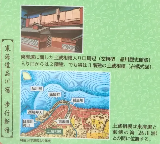 Dans Shinagawa-shuku, j’ai pris en photo la photo d’une maquette de l’ancien lupanar Dozō-Sagami, et d’une carte qui montre bien l’ancienne langue de terre le long de la baie.
