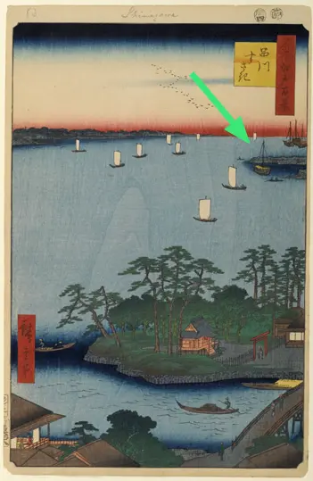 Si on traduit le nom de cette batterie 4, on obtient la batterie au pied de la colline du palais. Le palais en question était l’ancien palais d’Edo, qui se trouvait tout près de là. Cette colline, elle aussi, a été rasée et n’existe donc plus aujourd’hui. Elle figure toutefois sur une estampe d’une autre série de Hiroshige, intitulée 東都名所 (lieux célèbres de la capitale de l’Est, donc d’Edo).