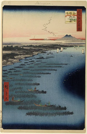 Vous aurez deviné que plus personne ne cultive aujourd’hui les algues dans ces eaux, au cœur de la ville. Il semble bien, également, qu’Hiroshige ait en quelque sorte inventé en partie ce paysage, car selon certains spécialistes, le mont Tsukuba n’était certainement pas visible de cette façon-là, même à l’époque du peintre.
