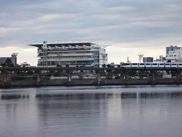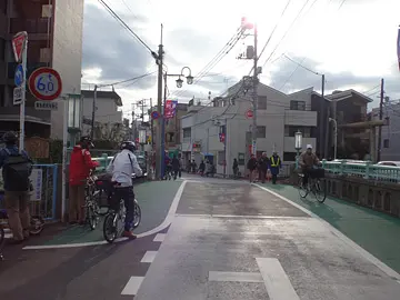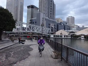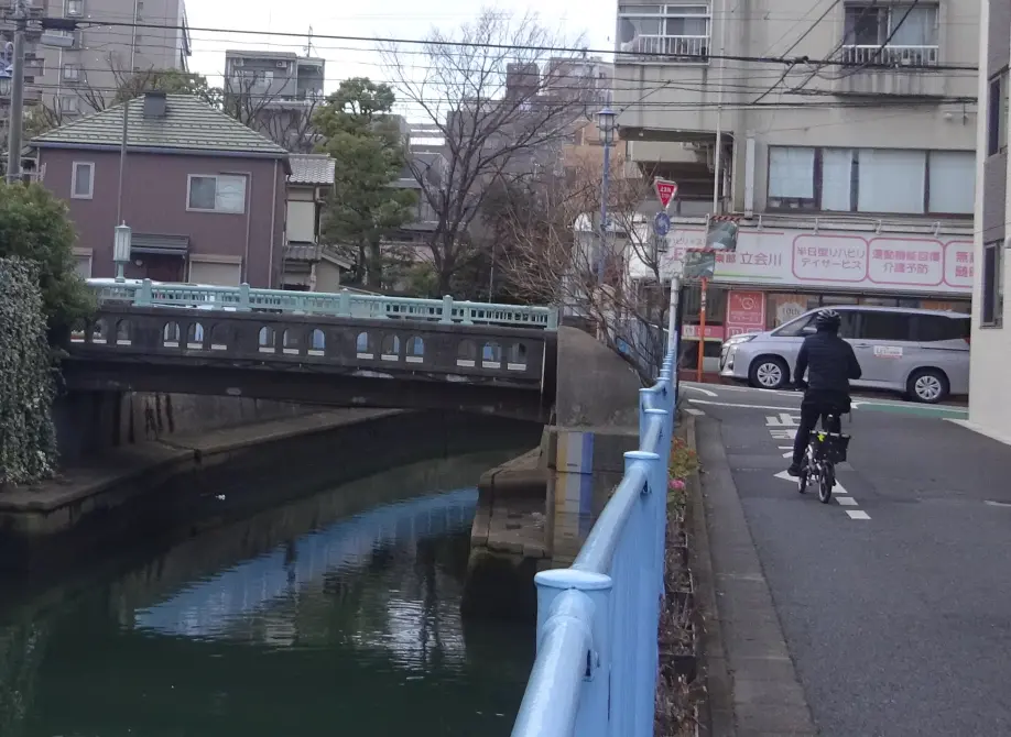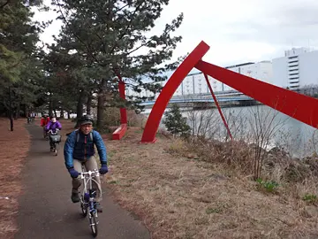 Après ces deux parcs, le trajet se termine en empruntant la piste cyclable et piétonne d’une suite de canaux. Sur celle du canal Keihin (京浜運河), les cyclistes peuvent contempler le train monorail qui passe carrément au-dessus du canal en longeant sa rive, avec à l’arrière-plan l’hippodrome Ōi (大井競馬場).