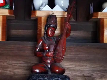 Elle a pour nom Benzaiten (弁財天). On rencontre aussi la graphie 弁才天 pour cette divinité féminine aux multiples vertus et talents, dont la partie 弁才 signifie en quelque sorte le don de l’éloquence, et, au sens plus large, de l’expression artistique. Divinité hindoue et japonaise, elle remplit tout un éventail de fonctions liées à l’expression, comme en faisait foi le premier caractère chinois de son ancienne graphie (辯財天) et continue de le faire celui de la graphie actuelle (弁財天), mais au Japon, en tant que divinité du bonheur, on semble l’apprécier davantage pour ses vertus de protectrice et dispensatrice de richesses (弁財天).