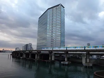 Le monorail vu depuis le pont Shinagawa Futō (品川ふ頭橋), sur le canal Keihin, avec son atmosphère surréaliste, dixit Geo Pottering