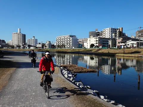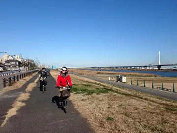 Sous un ciel bleu et le cœur léger, les vélos pliants roulent le long du vaste lit du fleuve Arakawa.