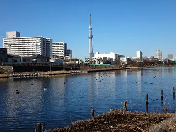La tour Skytree vue de la rive de l’Ancienne rivière Nakagawa