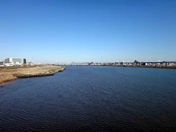 🚴 Pour atteindre les lieux de l’estampe, il nous faut aller sur la rive est du fleuve. Et pour ça, nous devons d’abord passer sous le Grand pont Hirai (平井大橋) et sous le pont ferroviaire de la ligne Sōbu de JR, puis traverser le pont suivant, c’est-à-dire le pont Komatsugawa (小松川橋). En essayant de mémoriser les noms de tous ces ponts, on peut s’arrêter sur le troisième un instant, ne serait-ce que pour reprendre notre souffle et contempler l’étendue du fleuve sous un autre angle.
