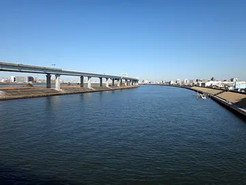 En traversant le fleuve sur ce pont, nous passons sous l’autoroute centrale périphérique de la capitale (首都高速中央環状線) puis au-dessus d’un autre cours d’eau… la rivière Nakagawa dont nous parlions tout à l’heure ; c’est sa partie en amont qui a été détournée et qui se jette dans la baie de Tokyo en longeant le fleuve Arakawa… exactement comme le ferait le tracé des deux roues arrière d’un tricycle géant, oui, c’est bien ça ^_^).