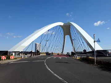 | 日本国内ではこうしたアーチからの吊り材(ケーブルやロッド)が斜めに張られた形式をニールセンローゼ橋と呼んでいますが、国際的にはネットワークアーチ橋と呼ばれています。(Sider) |