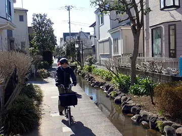 Les vélos empruntent ensuite le « sentier vert hydrophile Kamikoiwa » (上小岩親水緑道), qui passe le long d’un ancien canal d’irrigation agricole réaménagé en jolie promenade.