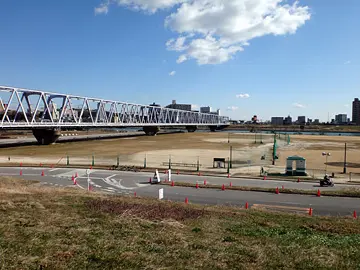 Le pont ferroviaire de la ligne Keisei-Honsen et, au loin, le fleuve Edo, vus depuis le panneau indiquant l’emplacement du site