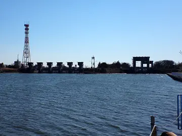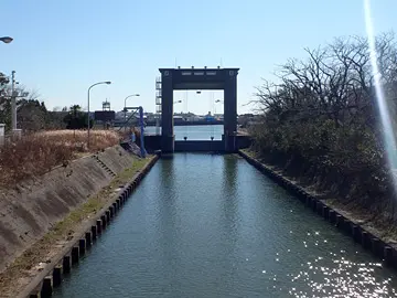 C’est à cette hauteur que le lit du fleuve Edo se sépare : son cours principal poursuit sa route vers la baie, tandis que ce qu’on appelle aujourd’hui l’Ancien fleuve Edo (旧江戸川) bifurque vers le sud-ouest pour aller se jeter dans la rivière Shin-Nakagawa. C’est cet embranchement que nous suivons, d’abord jusqu’à l’écluse d’Edogawa (江戸川水閘門), qui joue le rôle d’ascenseur fluvial. Construite de 1936 à 1943, elle permet aux embarcations de naviguer entre deux étendues d’eau de niveau différent, comme au canal de Panama.