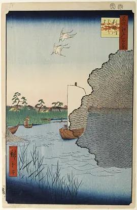Sur la dernière estampe, également, des hérons nous attendent. Cette vue a été prise par Hiroshige au point de jonction entre les rivières Nakagawa et Tatekawa (竪川).