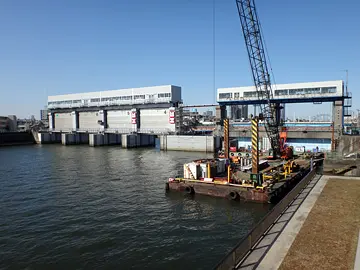 🚴 La troisième balade dans les arrondissements de Tōkyō, à la recherche des lieux d’où ont été immortalisées les Cent vues d’Edo du peintre Hiroshige, se poursuit vers le sud, le long de l’Ancien fleuve Edogawa (旧江戸川). Les vélos arrivent bientôt au Grand pont Mizuho (瑞穂大橋), là où la rivière Shin-Nakagawa (新中川) vient se jeter dans le fleuve. De là, on aperçoit l’écluse Imai (今井水門).