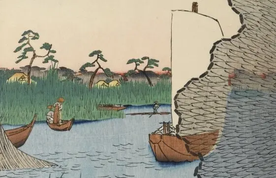 En zoomant, on peut voir que la partie verte qui s’étend de gauche à droite, jusque derrière le filet lancé, a toutes les apparences d’une île qui se détache de l’arrière-plan (la rive, en gris). Ceci dit, rien n’est sûr. D’autres pensent que la vue de cette estampe a été saisie encore plus au sud par le peintre, à la hauteur d’Urayasu (浦安).