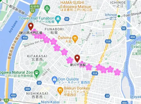 Le long de la rivière Shinkawa, on a aménagé une promenade dite des 1 000 cerisiers de Shinkawa (新川千本桜 Shinkawa Senbonzakura)…