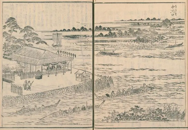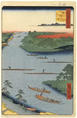 Cette route fluviale était alors la seule à relier la capitale à la fois aux fleuves Edo et Tone, ce qui en faisait une artère majeure du réseau fluvial de la capitale. Pour cette estampe, Hiroshige la contemplait depuis le poste de contrôle fluvial (船番所 funabansho) de Nakagawa. Ces postes de contrôle militaires inspectaient les bateaux, notamment pour y prélever la taxe sur le transport du sel (sel que transportaient fort vraisemblablement les bateaux qui longent la rive dans la partie supérieure gauche de l’estampe). De ces postes de contrôle militaires, on dit qu’à l’époque du peintre il y avait un certain relâchement dans les inspections, la paix régnant depuis plus de 200 ans sur l’archipel unifié par le gouvernement militaire des Tokugawa.