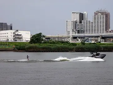 🚴 La balade se poursuit le long du fleuve Arakawa, au parc hydrophile Horikiri. Ce jour-là, la tour Skytree était visible au loin, tandis que tout près, une femme délicate et gracieuse de la capitale faisait du ski nautique sur le fleuve.