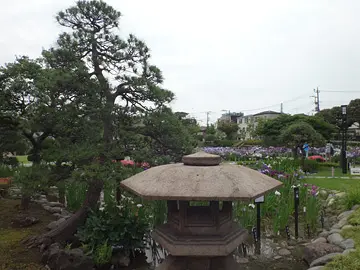 Ce jardin botanique est la principale attraction touristique de l’arrondissement de Katsushika, et un lieu incontournable de la capitale pour la contemplation des fleurs. À l’entrée du jardin, une lanterne de pierre ( 石灯籠 ) accueille les visiteurs. Derrière elle s’étend le champ d’iris, en pleine floraison.