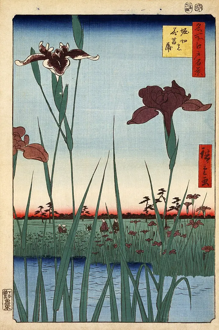 Le jardin d’iris de Horikiri, mai 1857, estampe 64 sur Wikipédia
