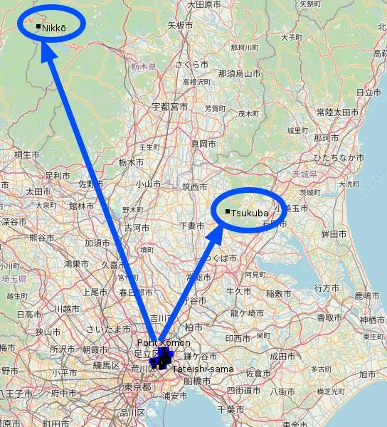 Pour nous aider à visualiser, j’ai importé les coordonnées du mont Tsukuba et des monts Nikkō dans le logiciel GpsPrune. La flèche de droite pointe vers le premier, et celle de gauche vers les seconds.