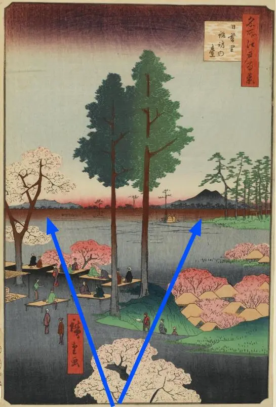 Encore une fois Hiroshige déforme la réalité au profit de l’effet visuel, cette fois-ci en faisant serpenter le cours de la rivière Hikifunegawa, rectiligne, qu’il avait devant les yeux.