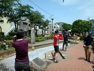 Dans le parc hydrophile complètement à sec ce jour-là, les membres de Geo Pottering ont accepté de faire la pose pour imiter les haleurs de l’époque Edo…