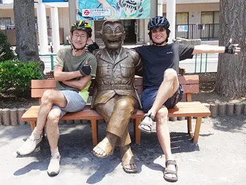 L’étape suivante de la balade est celle de la gare 亀有駅 . Les vélos s’y rendent par la rue marchande du côté nord et sont accueillis, à la sortie nord de la gare, par la statue d’un célèbre personnage de manga, le policier Ryō-san (両さん).