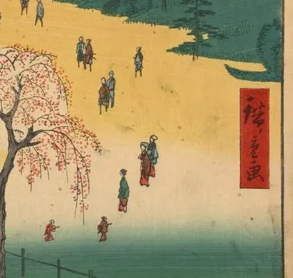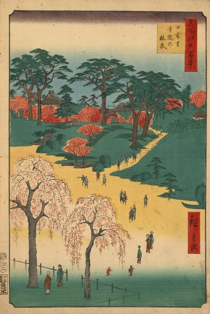 Jardins du temple à Nippori, février 1857, estampe 14 sur Wikipédia. Hiroshige présente à la fois le printemps et l’automne sur cette estampe, avec les cerisiers en fleurs à l’avant-plan et les feuillages d’automne à l’arrière-plan.