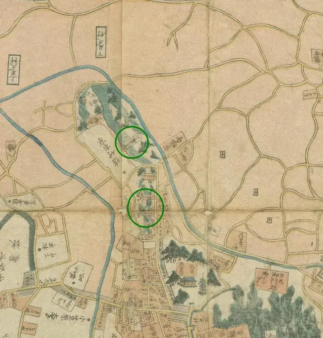Sur cette carte de 1847, on peut voir dans le cercle du haut le plateau Dōkan-yama (道灌山) dont nous avons parlé au début du présent billet, et, dans le cercle du bas, la zone où se trouvaient les trois temples et leurs jardins. La gare d’où notre balade a commencé, Nippori, se trouve(rait) en bas à droite du cercle inférieur sur cette carte. À gauche du même cercle : le plateau d’où la vue a vraisemblablement été peinte et dont la pente donnera son nom au quartier. À part la topographie, il ne reste à peu près rien de cette vue, aujourd’hui effacée par le pinceau de béton de l’urbanisation.