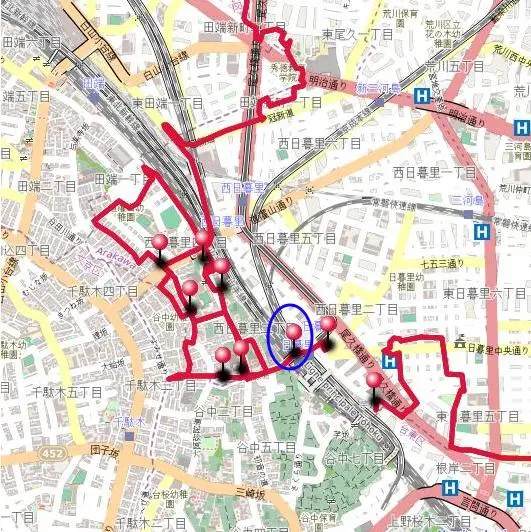 Le parcours pénètre ensuite dans la toute petite partie de l’arrondissement d’Arakawa située à l’intérieur du cercle de la ligne de chemin de fer Yamanote.