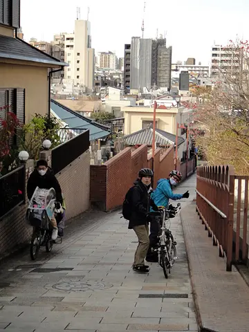 En roulant dans la direction de la rue marchande Yanaka-Ginza (谷中銀座), et sachant que les commerces n’y ouvrent pas avant 10 h, les vélos et leurs compagnons bipèdes longent sans se hâter la limite administrative qui sépare les arrondissements d’Arakawa (荒川区) et de Taitō (台東区).