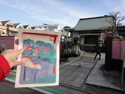 Sur son estampe intitulée « Jardins du temple à Nippori » 日暮里寺院の林泉 , Hiroshige a peint les lieux en plongée, vraisemblablement en regardant vers l’est depuis un plateau.