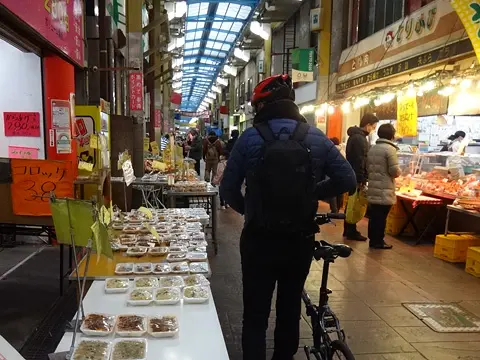 🚴 Le trajet de la balade pénètre ensuite de biais sous l’arcade d’une rue marchande qui a pour nom Joyful Minowa (ジョイフル三ノ輪). Celle-ci, petites rues transversales incluses, s’étend sur environ 400 mètres.