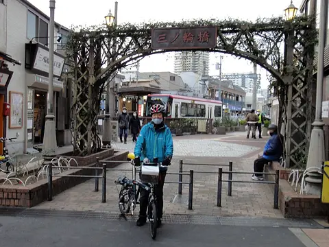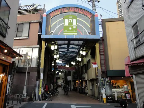 Après avoir traversé l’arcade d’est en ouest, le groupe arrive à une gare de la ligne de tramway Toden, d’où il s’engage dans un étroit passage aboutissant cette fois-ci… à l’entrée de l’arcade, où se trouve le terminus du tramway.