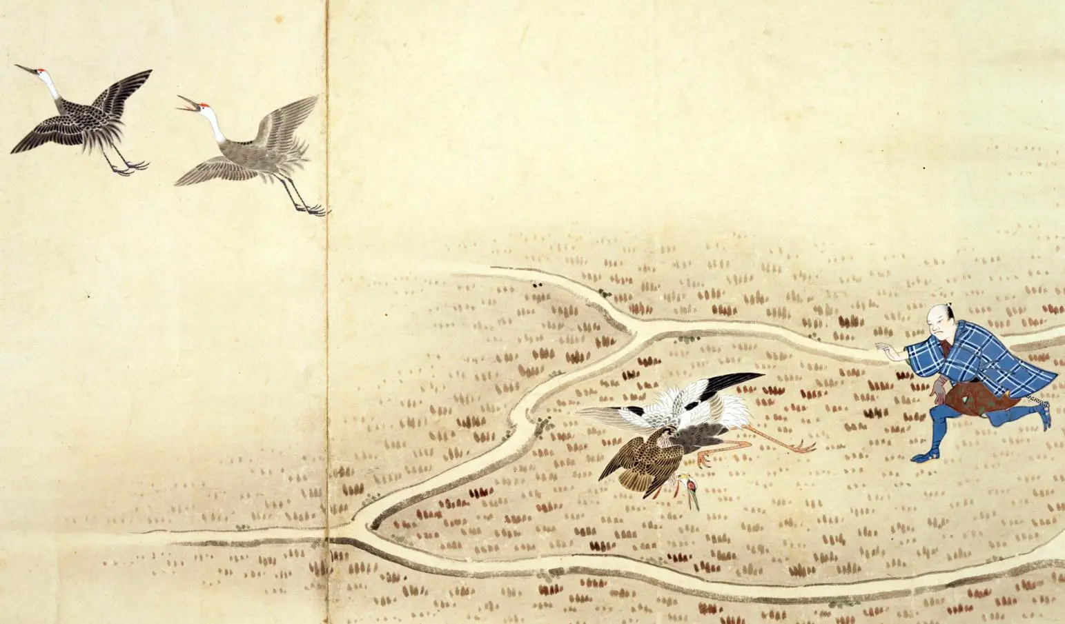 Il ne s’agissait toutefois pas des grues du Japon qui figurent sur l’estampe. La viande de celles-ci, en fait, n’avait pas bonne réputation au Japon. On la disait dure et fade (肉が堅く不味い), nous dit la version japonaise de Wikipédia. Bien plus appréciées étaient la grue à cou blanc (マナヅル) et la grue moine (ナベヅル), comme l’illustre bien cet extrait d’un vieil emaki (絵巻).