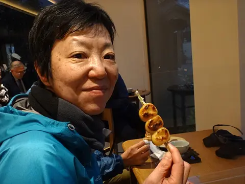 Salīna, sourire aux lèvres, en pleine dégustation de dango