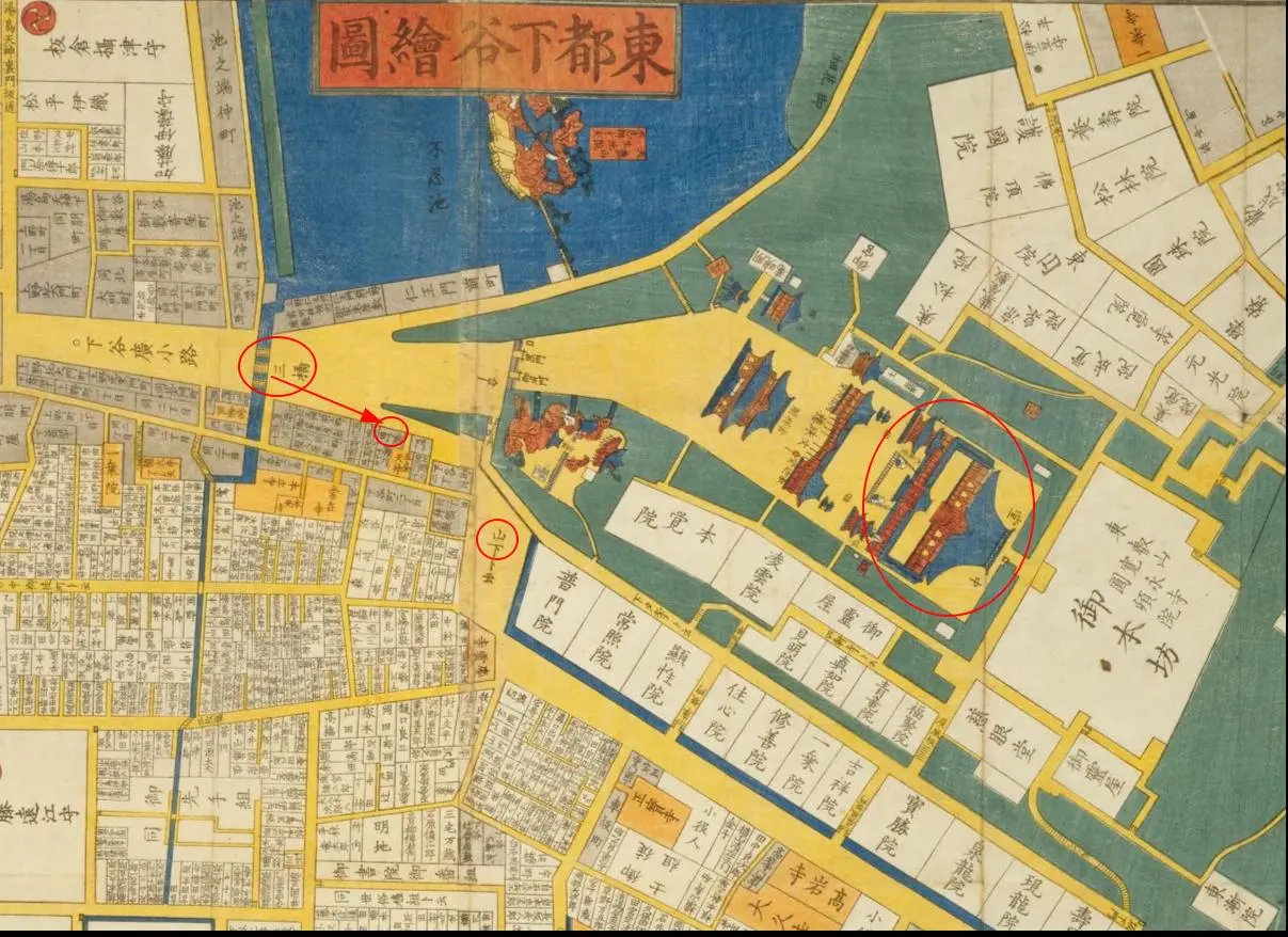 La largeur de la rue de cette zone appelée Yamashita à l’époque du peintre s’explique par l’incendie dévastateur de 1657 appelé Grand incendie de Meireki. Par la suite, de larges rues ont été aménagées ici et là dans Edo pour empêcher la propagation du feu. La carte montre bien comment le temple a ainsi isolé ses bâtiments des résidences et commerces environnants (je parle de la longue et large rue oblique qui descend vers le coin droit de la carte, longée par un canal en bleu).